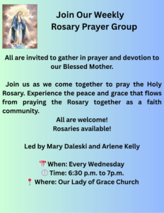 The Rosary group meets each Wednesday from 6:30pm to 7:00pm in the Church. The Rosary is prayed, and scriptural readings are shared. The group welcomes women and men of the parish to join in prayer.